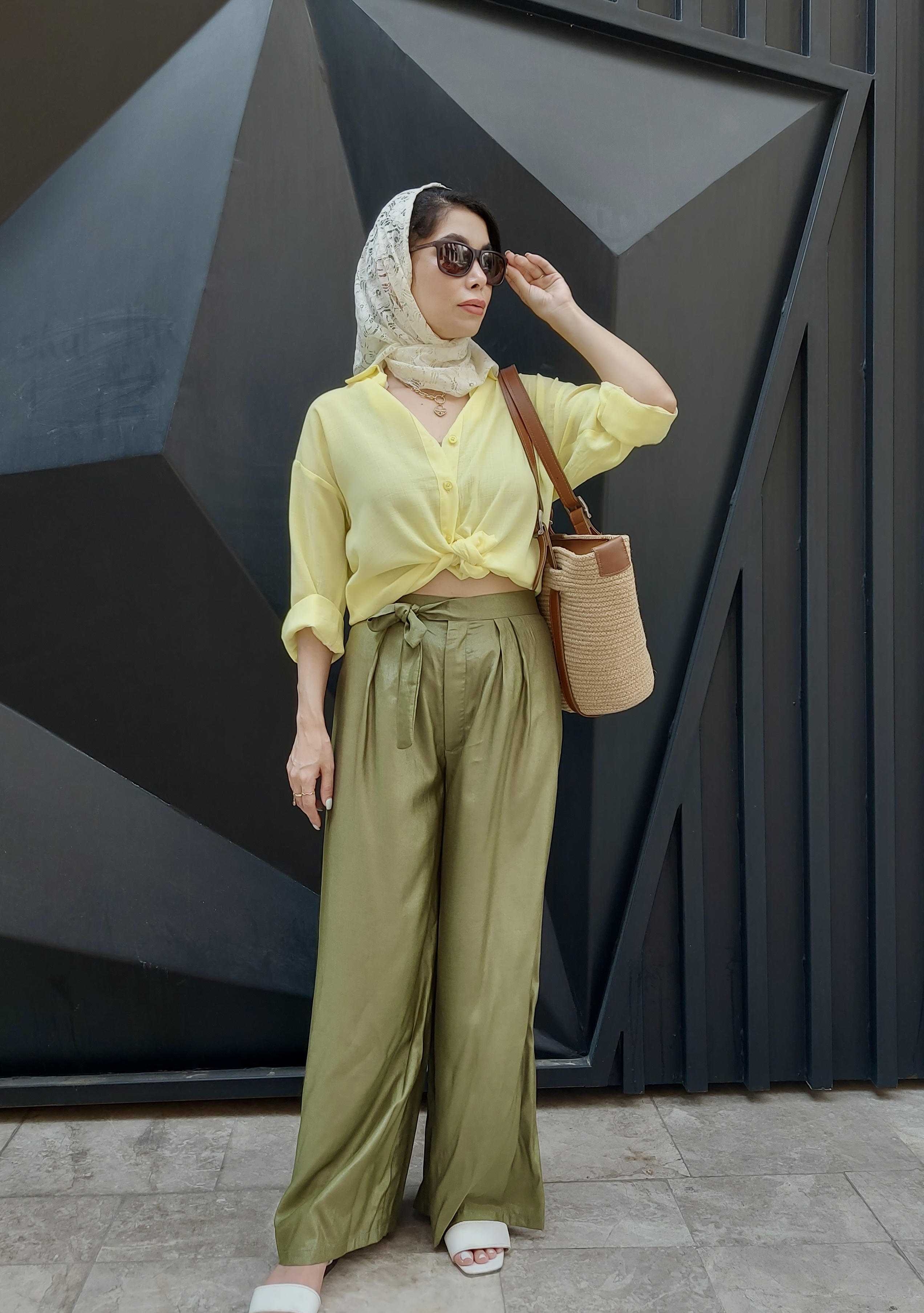 پارچه شلوار رنگ زیتونی بسیار سبک و نرم دارای کمی شاین جلو کمر پشت کش
